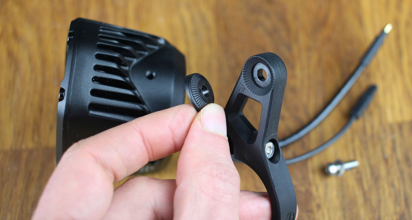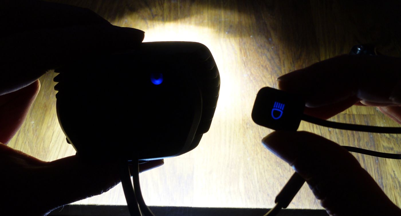 Außer der richtigen Spannung muss der Lichtausgang aber auch genügend Leistung zur Verfügung stellen. 28 W benötigt der Scheinwerfer laut Hersteller bei aktivem Fernlicht, was nicht jeder Lichtausgang schafft. Mit dem zweiten Eingang kann hier aber Abhilfe geschaffen werden. Reicht auch das nicht, lässt sich aber auch die Leistung des Fernlichts auf einen niedrigeren Wert programmieren. Dazu wird der Taster an der Rückseite der Lampe gedrückt, bis dieser anfängt zu blinken. Mit einem kurzen Druck können dann drei Fernlichtstufen durchgeschaltet werden: grün (17 W), gelb (22 W) und rot (28 W). Wartet man eine Weile, hört das Blinken des Tasters auf und der Scheinwerfer speichert den Leistungswert für das Fernlicht.