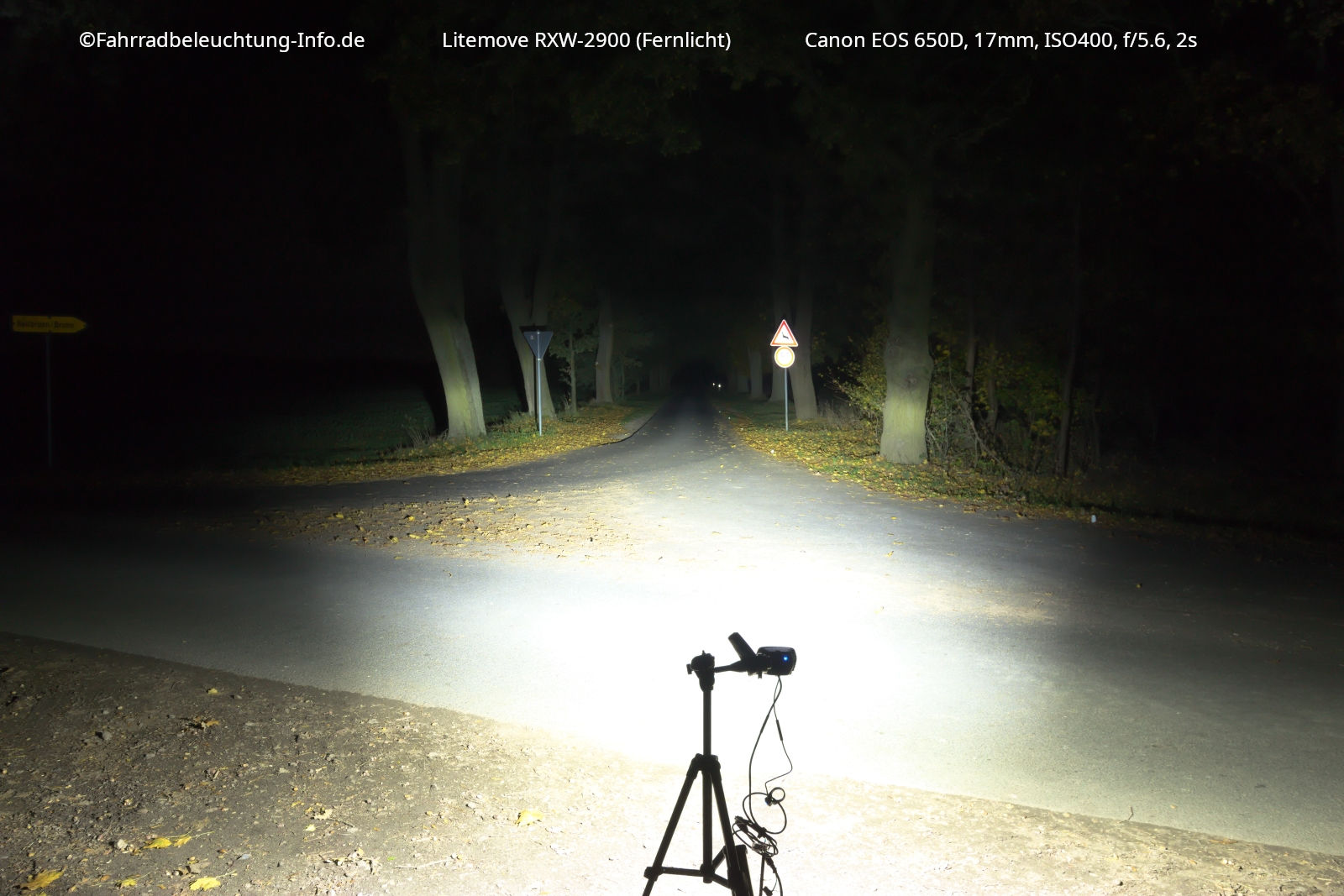 Hier ein Foto der Ausleuchtung des Litemove RXW-2900. Siehe auch Aufbau und Kameraeinstellungen. Für mehr Ausleuchtungsfotos von E-Bike-Scheinwerfern siehe Übersicht E-Bike-Scheinwerfer.
