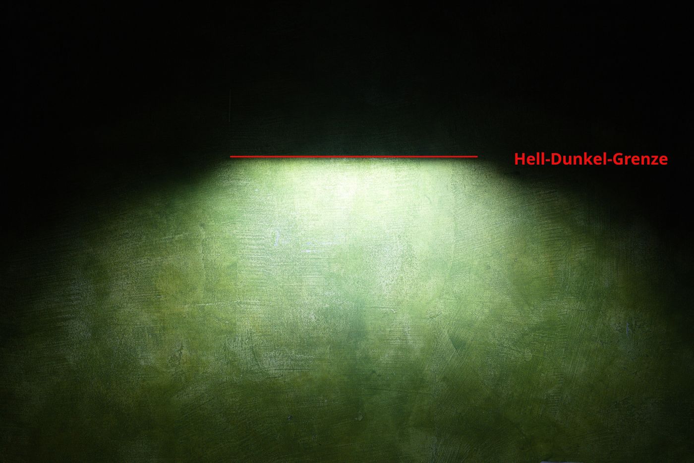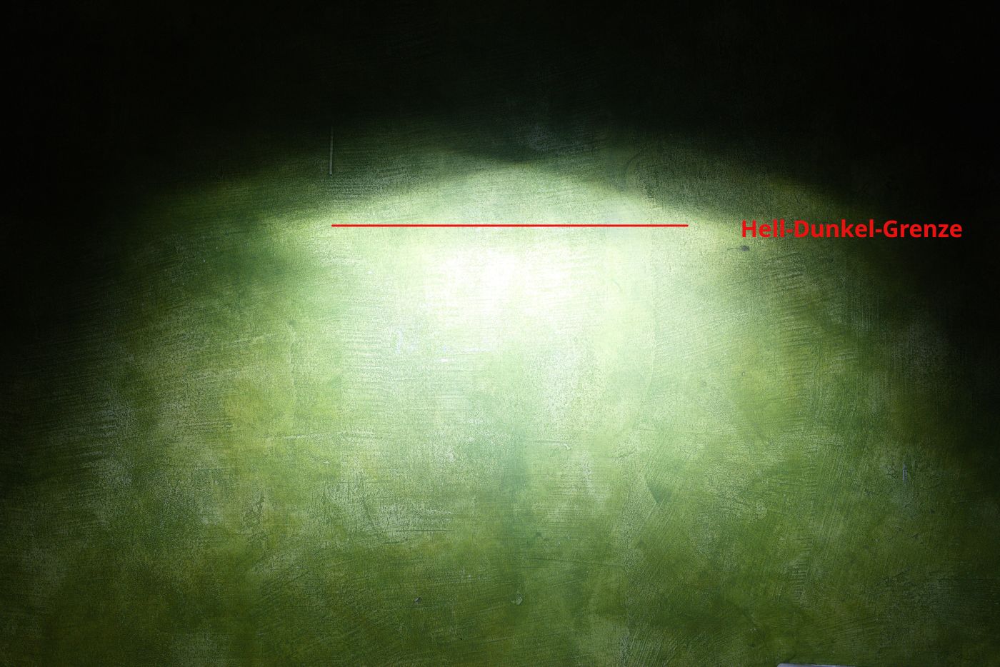 Abblendlicht und Fernlicht in der Wandprojektion. Der Anteil des Fernlichts über der Hell-Dunkel-Grenze ist recht wenig intensiv