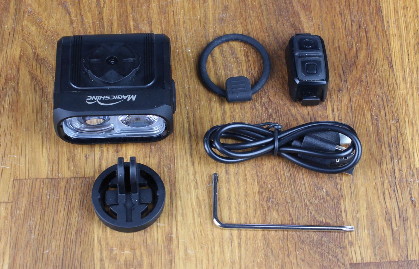 Im Lieferumfang sind die Fernbedienung mit Gummiband zur Befestigung, ein USB-C Ladekabel, Halterung (Garmin-Mount auf Gopro) und ein Sechsrund-Schlüssel, mit dem die Halterungsaufnahme an der Lampe abgeschraubt und stattdessen unter der Lampe befestigt werden kann. Auch eine gedruckte Bedienungsanleitung ist dabei.