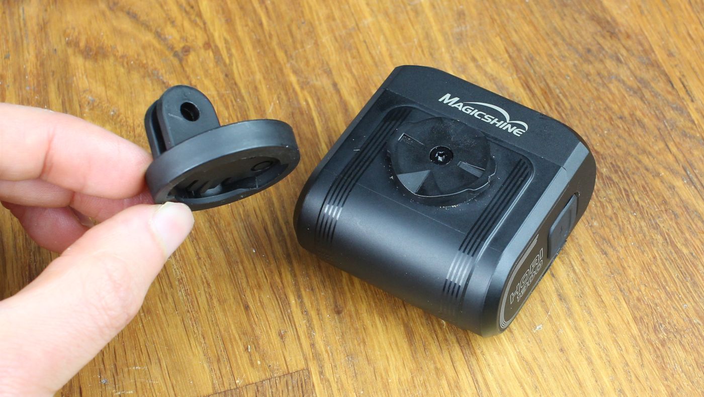 Das Gegenstück zur Garmin-Halterung kann aber unter die Lampe geschraubt werden. Einfach mit dem mitgelieferten Torx-Schlüssel abschrauben und die Abdeckkappe an der Unterseite abschrauben, die Halterung dann dort festschrauben. So ergeben sich weitere Befestigungsmöglichkeiten.