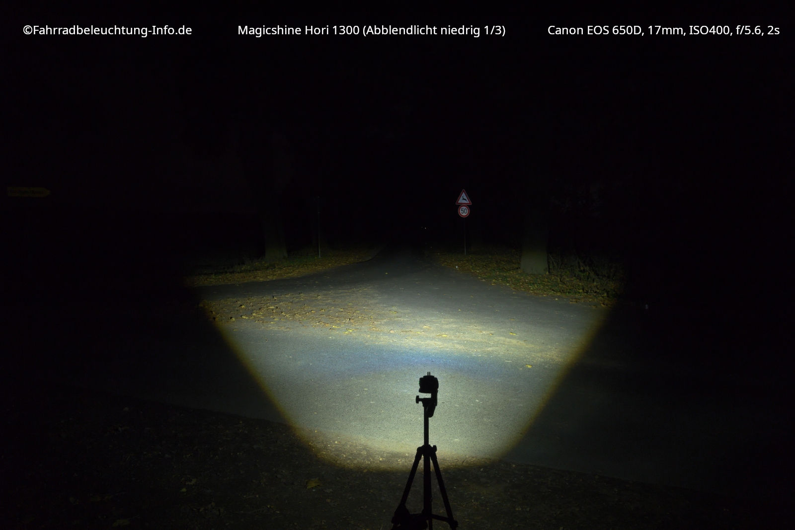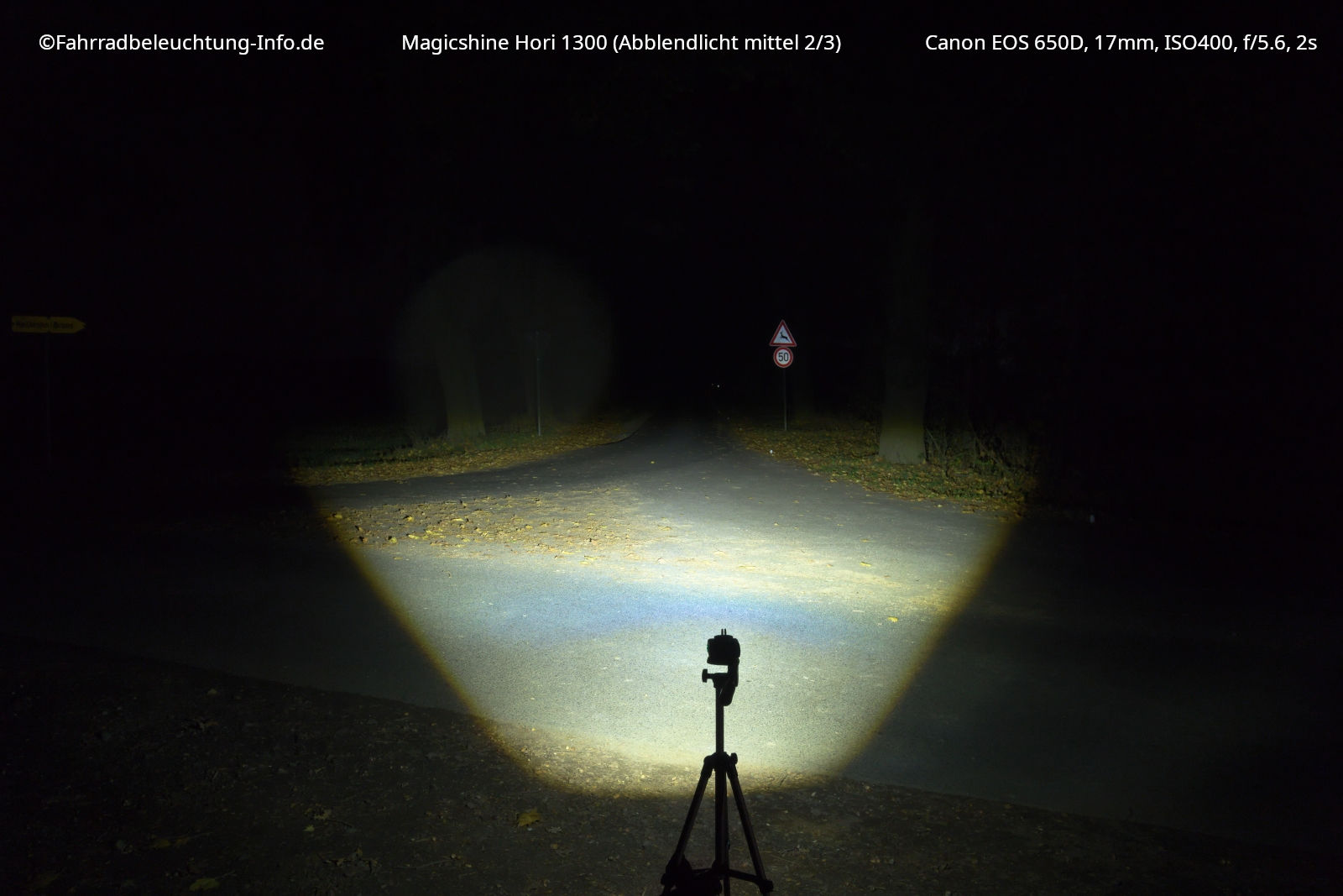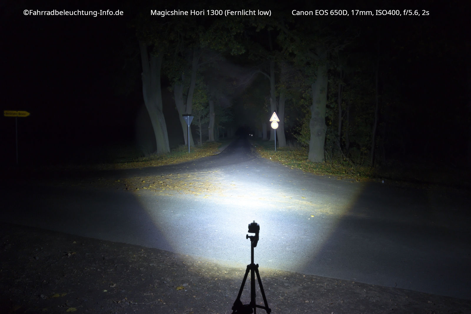 Hier Fotos der Ausleuchtung der Magicshine Hori 1300. Siehe auch Aufbau und Kameraeinstellungen. Für mehr Ausleuchtungsfotos von Akkuscheinwerfern siehe Übersicht Akkuscheinwerfer.