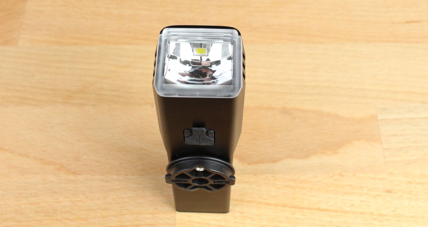 Vorn im Gehäuse ist der Reflektor zu sehen und die LED, die von oben indirekt über den Reflektor nach vorn strahlt. Ein übliches Vorgehen, wenn man eine straßengeeignete Lampe mit abgeblendetem Lichtbild konstruiert (Linsenkonstruktionen sind allerdings auch möglich). Die LED hat allerdings eine recht große Emitterfläche, was zusammen mit dem recht kleinen Reflektor eine definierte Lichtverteilung schwierig macht.