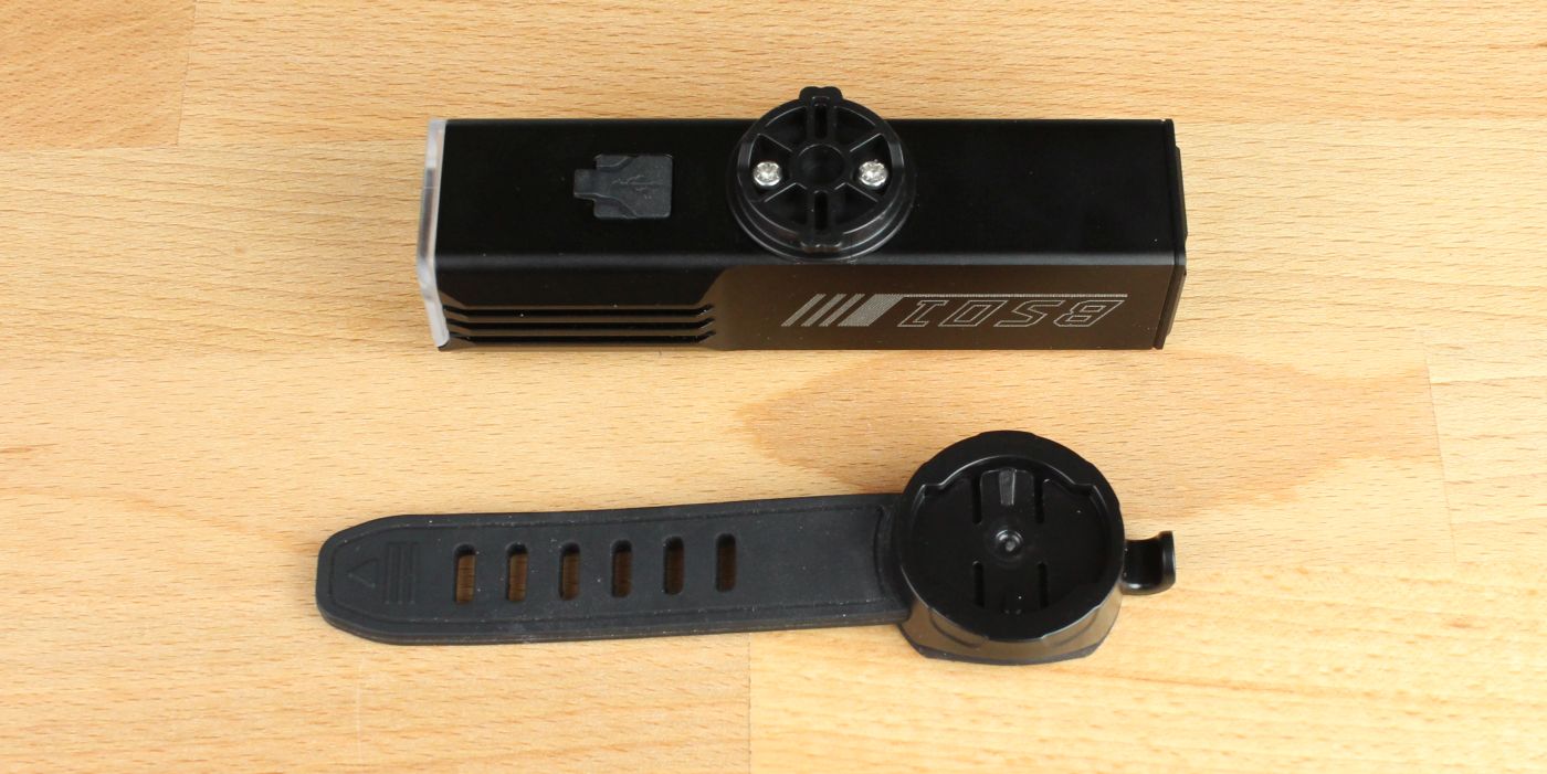 Die Halterung nutzt einen Garmin-Mount, der per Gummiband am Lenker befestigt wird. Die Lampe wird anschließend durch eine 90°-Drehung sicher verriegelt. Dank der weit verbreiteten Standardaufnahme lassen sich kompatible Halterungen anderer Hersteller problemlos nachkaufen oder austauschen.