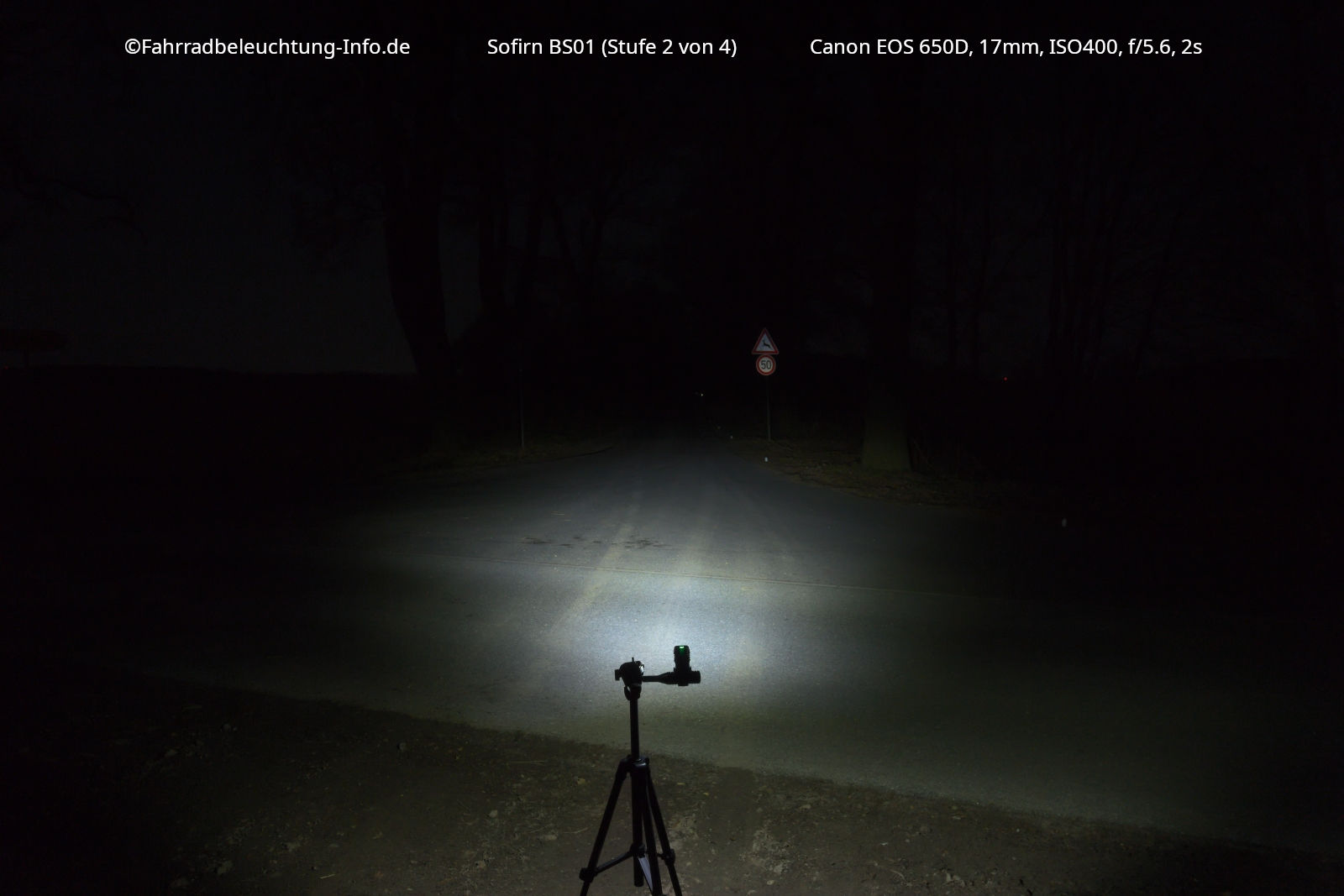 Hier die höchste Leuchtstufe, noch während des Boosts in den ersten 3 Minuten. Hier ist die Lampe noch um einiges heller als in der zweithöchsten Leuchtstufe. Selbst die Fernsicht ist hier noch einigermaßen passabel, auch wenn sich das Auge etwas auf die sehr hellen Bereiche im Nahbereich einstellt. Im vorderen und mittleren Bereich ist die Helligkeit im Boost-Modus so hoch, dass man selbst in sehr schwierigen Situationen (z.B. entgegenkommendes Fernlicht) genug Reserven hat.