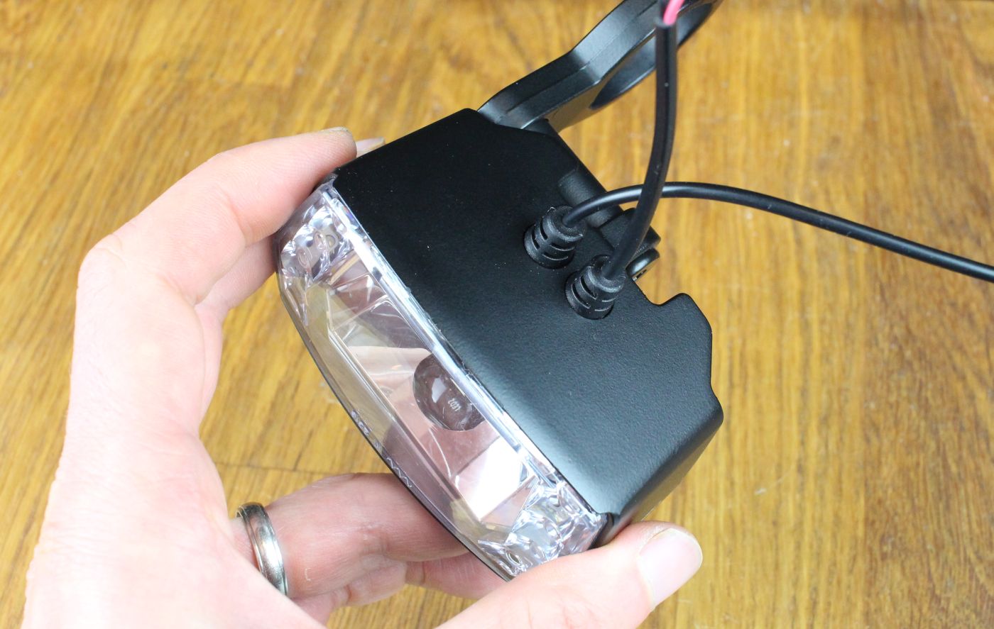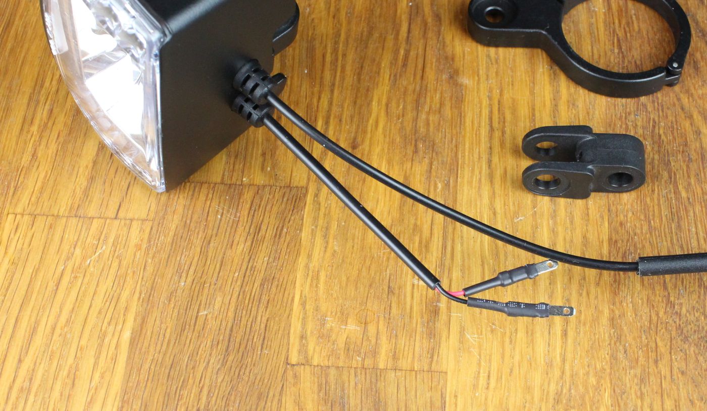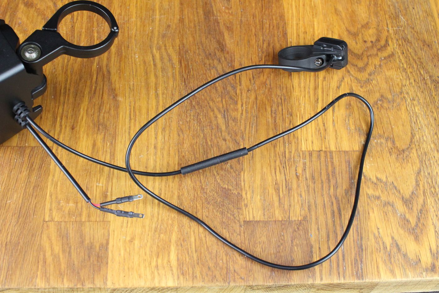 Unten am Gehäuse sind die Anschlüsse für Stromversorgung und Lenkertaster zu sehen. Sie sind mit einem ordentlichen Knickschutz versehen, was hoffentlich der Lebensdauer zugute kommt.
