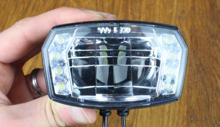 Oben im Gehäuse sind die LEDs für Abblend- und Fernlicht zu sehen. Sie leuchten indirekt über den Reflektor nach vorn. Vor den LEDs ist zusätzlich eine kleine Linse angebracht, welche auch zur richtigen Lichtverteilung beiträgt.