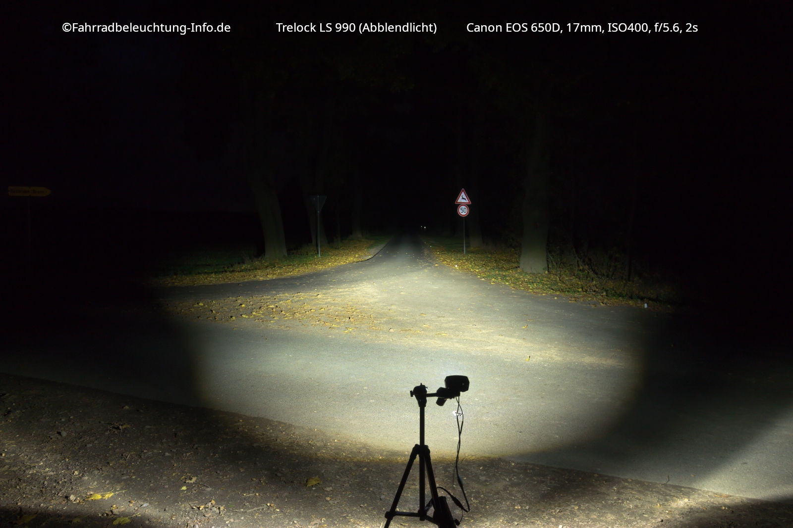 Hier ein Foto der Ausleuchtung der Trelock LS 990. Siehe auch Aufbau und Kameraeinstellungen. Für mehr Ausleuchtungsfotos von E-Bike-Scheinwerfern siehe Übersicht E-Bike-Scheinwerfer.