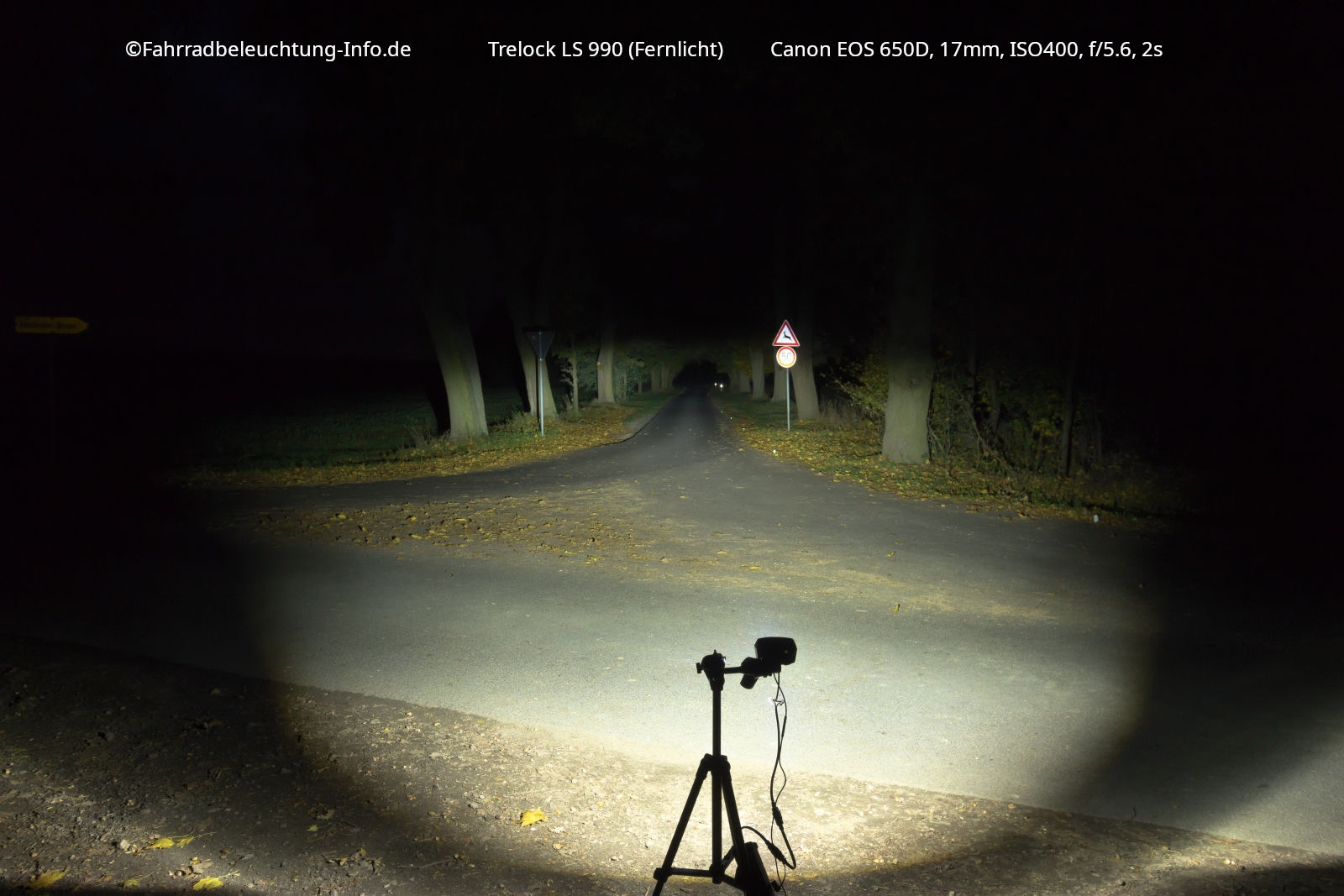 Trelock LS 990 kaufen bei:Das Fernlicht der LS 990 leuchtet nur sehr knapp über die Hell-Dunkel-Grenze des Abblendlichts hinaus. Eine Rundumsicht, wie das manch anderes Fernlicht schafft, ist damit nicht möglich. Dafür ist das Fernlicht der LS 990 aber stark konzentriert und schafft in einem kleinen Bereich eine sehr gute Fernsicht.